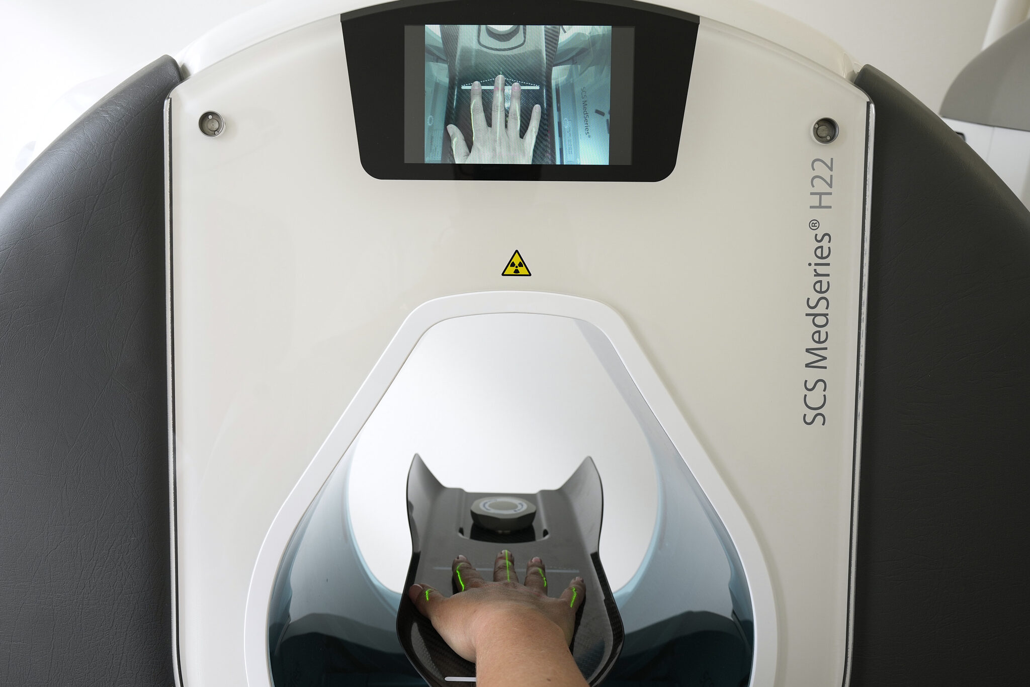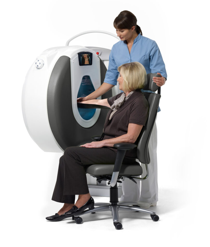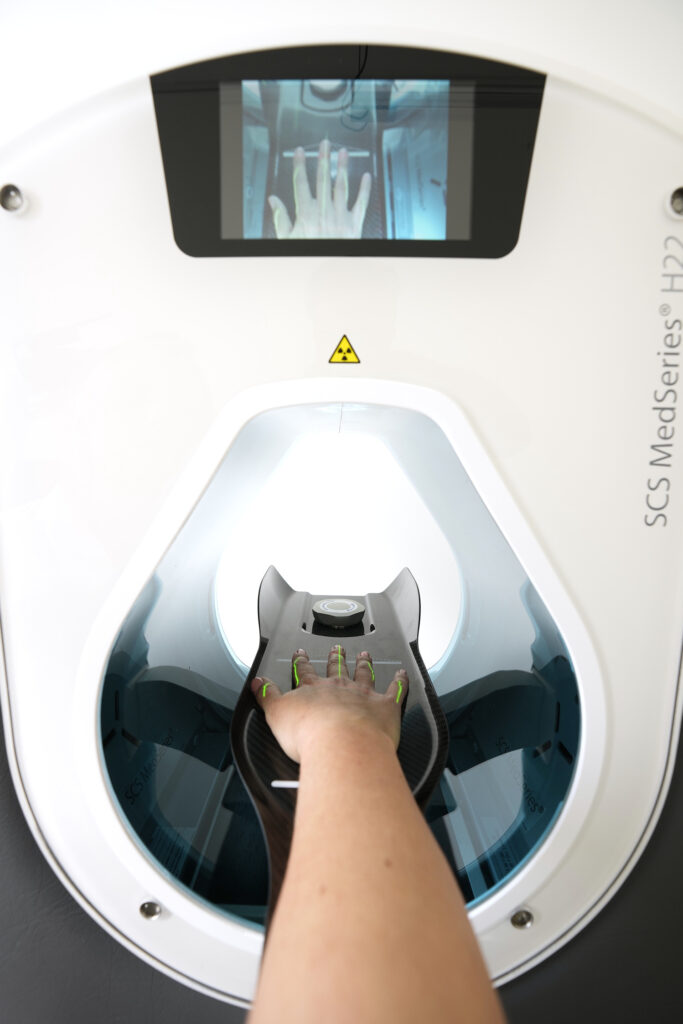 Der digitale Volumentomograph (DVT) fertigt dreidimensionale Röntgenaufnahmen für Hand, Ellenbogen und Armen innerhalb von wenigen Sekunden an. Hierbei profitieren Patienten vor allem von der unmittelbaren Verfügbarkeit in der Praxis und einer erheblich reduzierten Strahlenbelastung im Vergleich zu einem herkömmlichen CT.